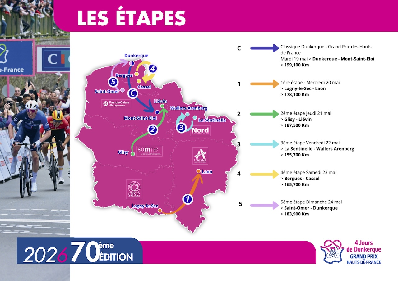 Pour sa 70ème édition, les 4 Jours de Dunkerque Grand Prix des Hauts-de-France s’offrent un parcours d’anthologie. Six jours de course exigeants, une classique relevée dès le mardi entre la cité de Jean Bart et le Mont Saint-Éloi, des pavés à Wallers-Arenberg, de la haute voltige dans les monts de Flandre et à Cassel avant un final entre Audomarois et la Flandre maritime entre Saint-Omer et Dunkerque.