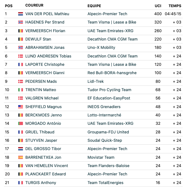 Quatre coureurs : Hagenes, Abrahamsen, Vermeersch et Dewulf. Pas une relance. Vermeersch se retourne, personne n’accélère. Ils se regardent. Van der Poel, lui, il y croit encore. Il sort un ultime sprint, passe tout le monde, lève les bras. Hagenes prend la deuxième place devant Vermeersch, le grand perdant du jour.
