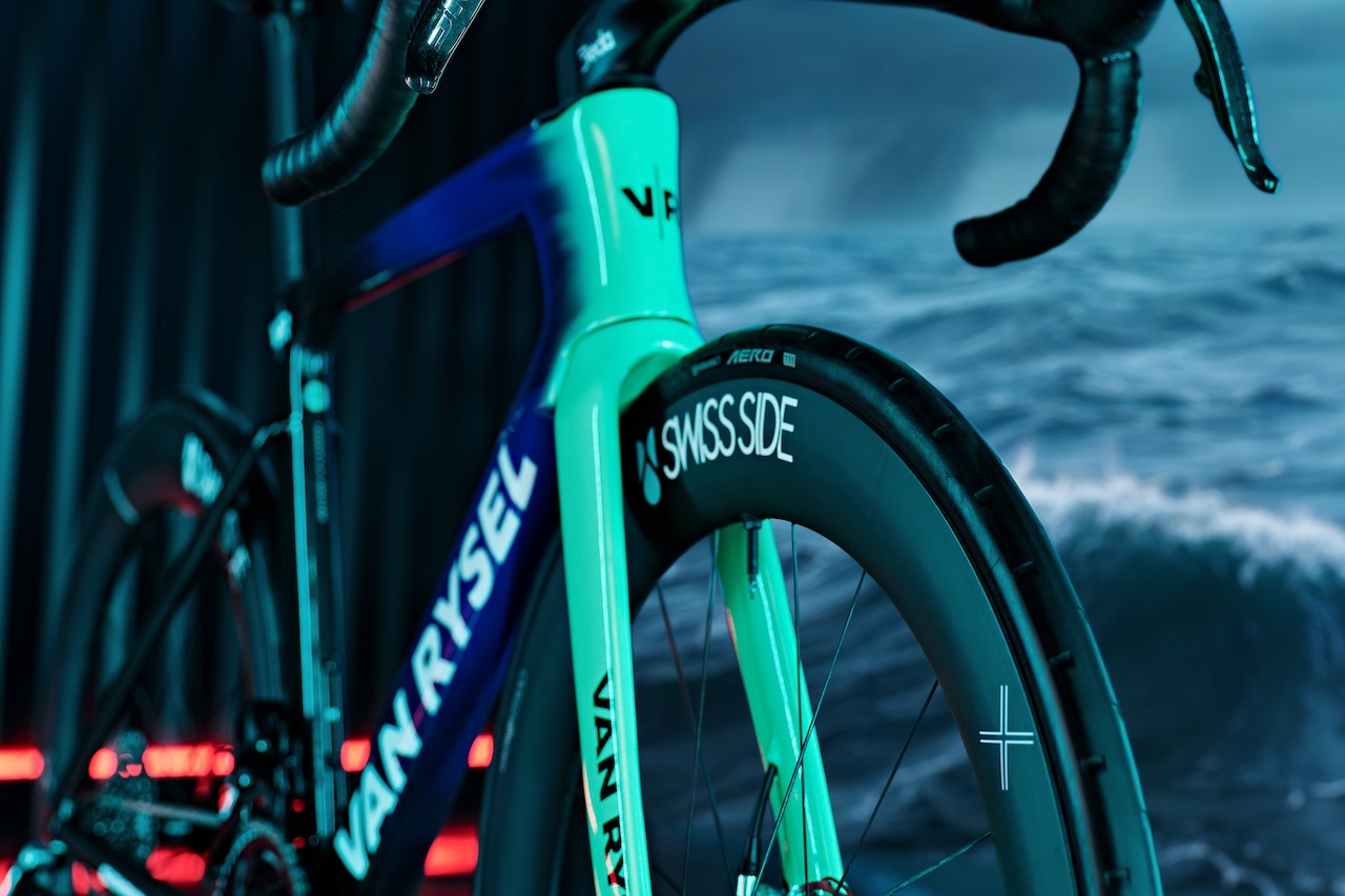 Le choix d’un dégradé central du bleu vers le rouge symbolise cette transition. Les manches affichent volontairement deux couleurs distinctes avec le vert turquoise à gauche et un bleu profond à droite. Le cuissard, dans un bleu très sombre, apporte une touche de sobriété, tandis que la finition technique, notamment les manches côtelées, reste fidèle aux standards de Van Rysel, qui continue d’asseoir son savoir-faire à l’international.