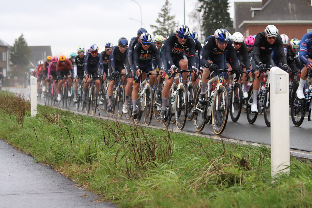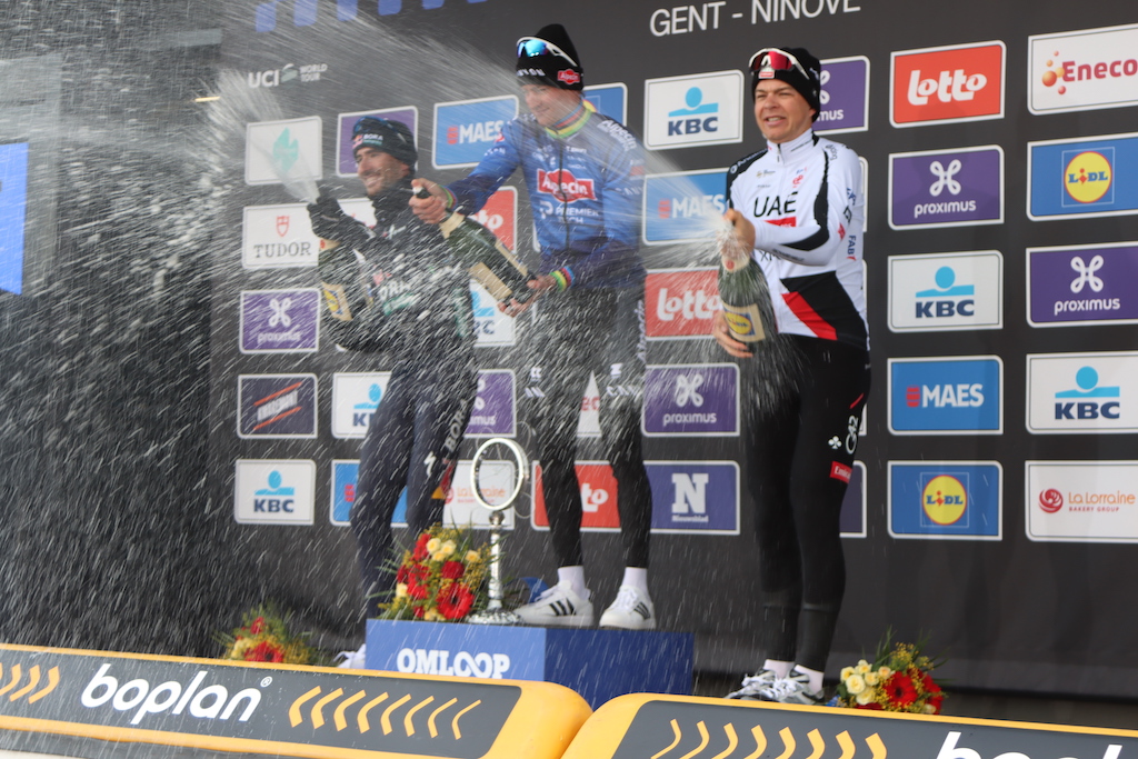 La course avait pourtant tout d’un chaos organisé. Les pavés de l’Eikenberg avaient déjà fait le ménage dans le peloton. Sur le Molenberg, un sauvetage miraculeux lui avait permis d’éviter la chute d’un coureur tombé devant lui. Avec Tim van Dijke et Florian Vermeersch, il formait un trio de tête qui allait sceller le sort de la journée. Puis vint le Muur van Geraardsbergen à seize kilomètres de l’arrivée… Et en une accélération, tout est réglé. Van Dijke a pris la deuxième place au sprint, Vermeersch complétait le podium.