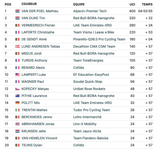 Premier coureur depuis Michele Bartoli en 2001 à s’imposer à l’Omloop dès sa première participation, Van der Poel envoie un message à toute la concurrence avant les Monuments du printemps. Le Tour des Flandres et Paris-Roubaix sont prévenus. Le patron est là. A noter la présence de trois tricolores dans le Top 15 : Christophe Laporte (4e), Anthony Turgis (8e), Alexis Renard (9) et Paul Magnier (11e).