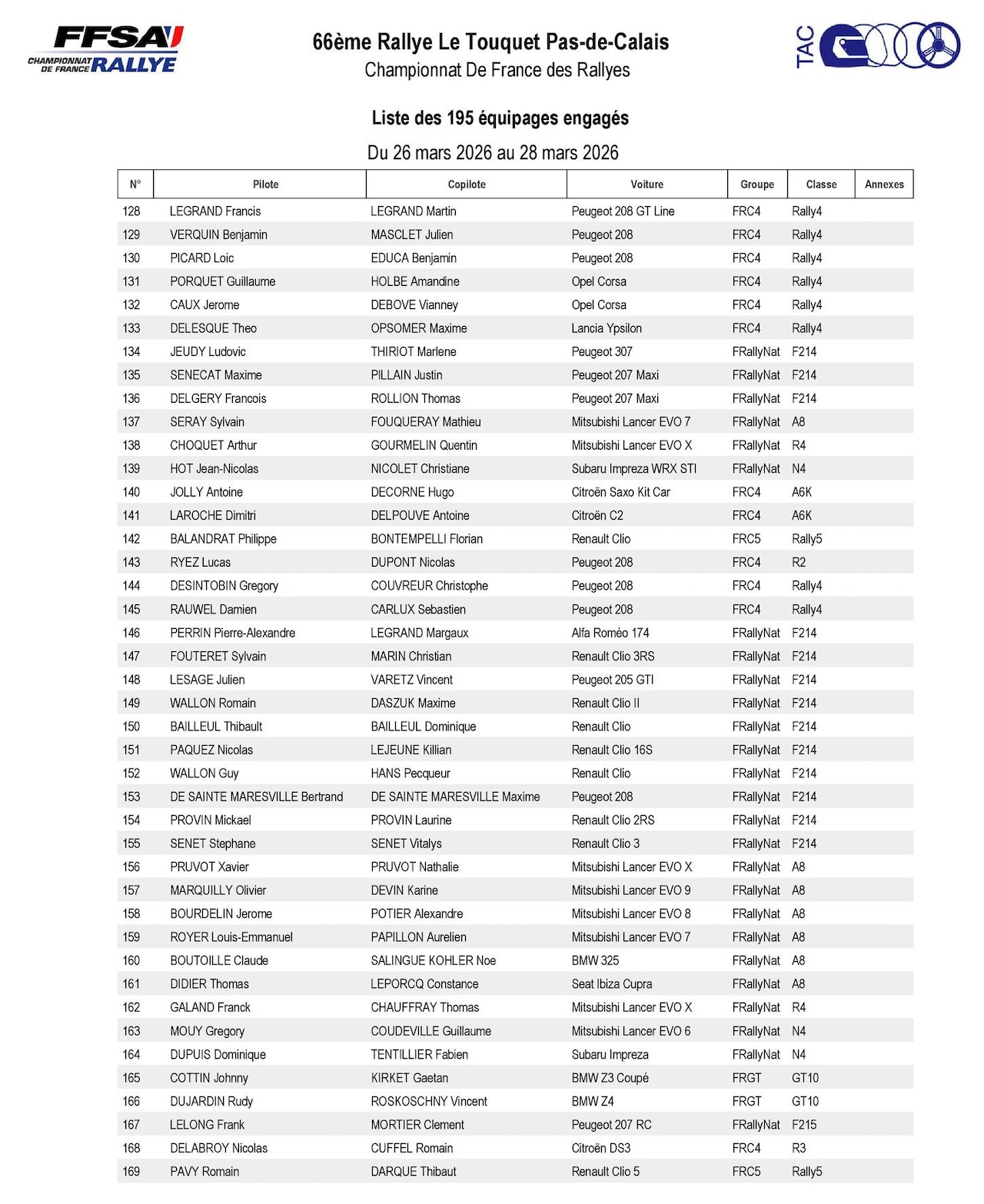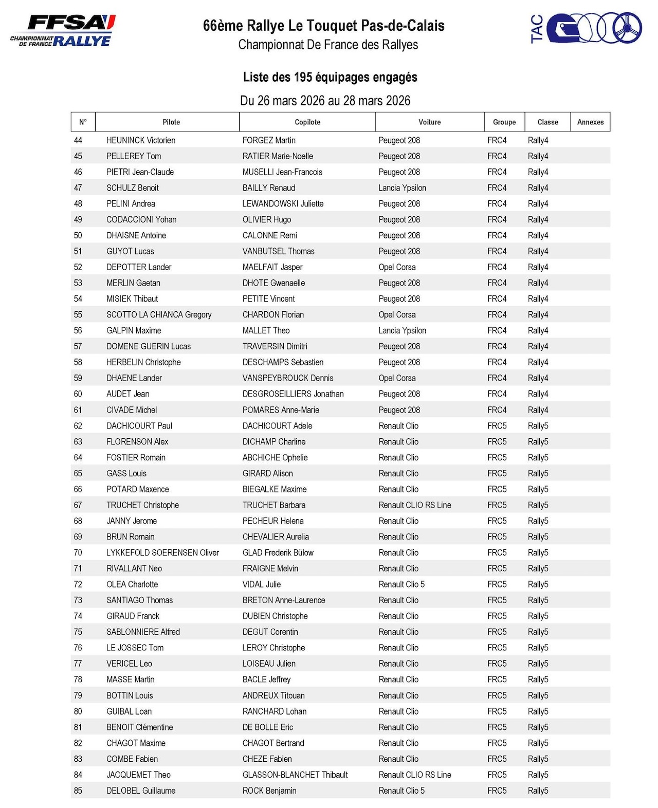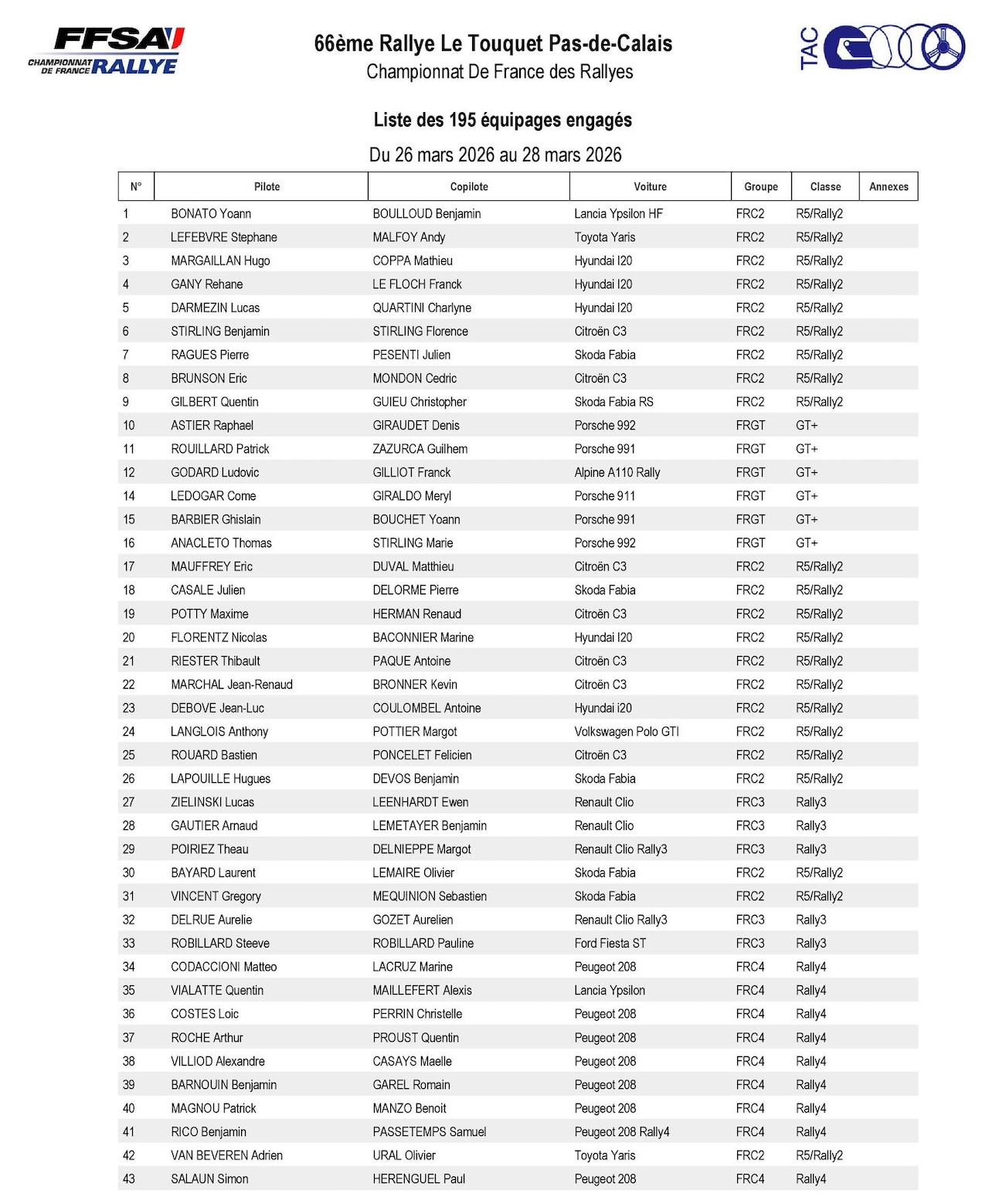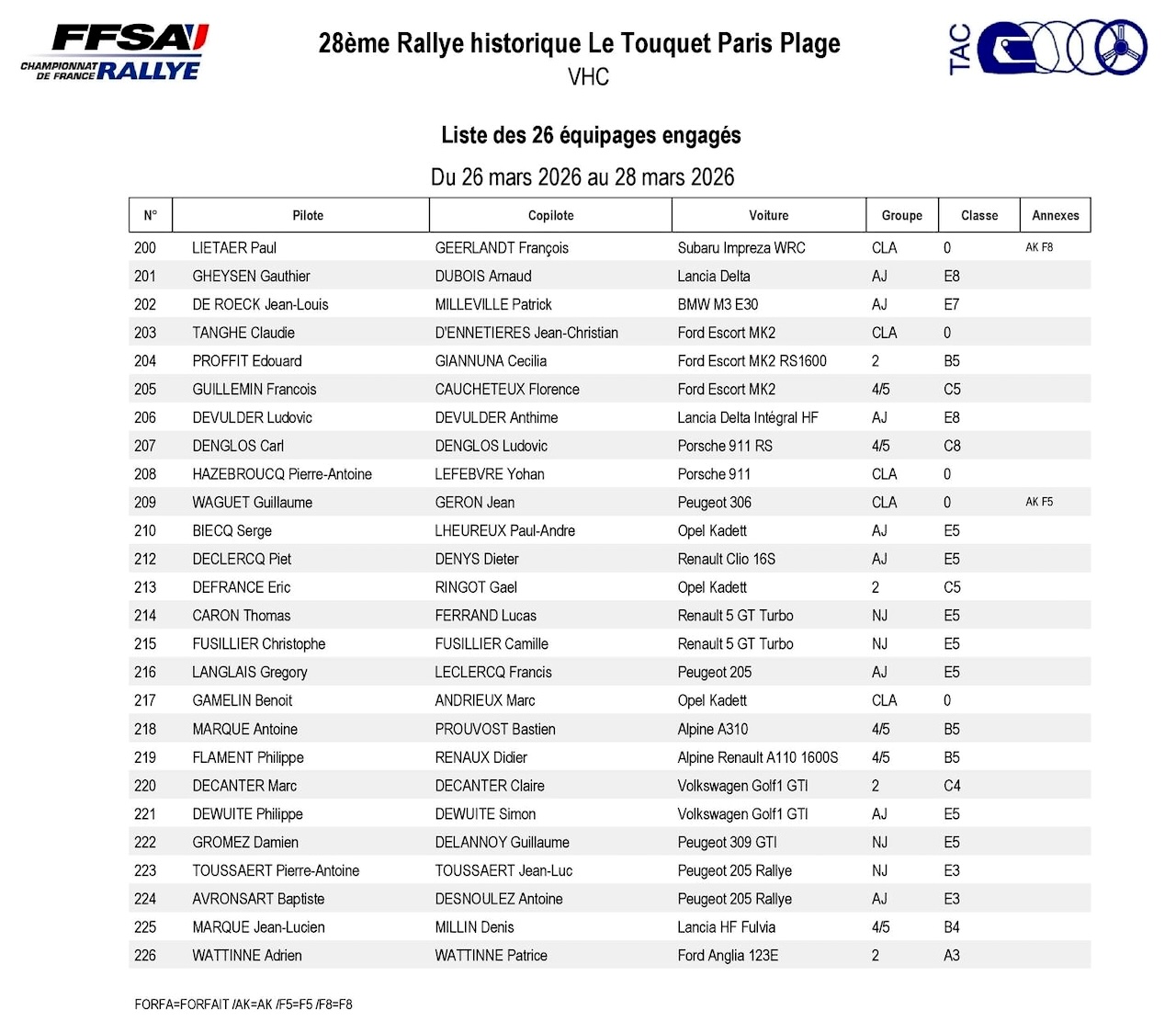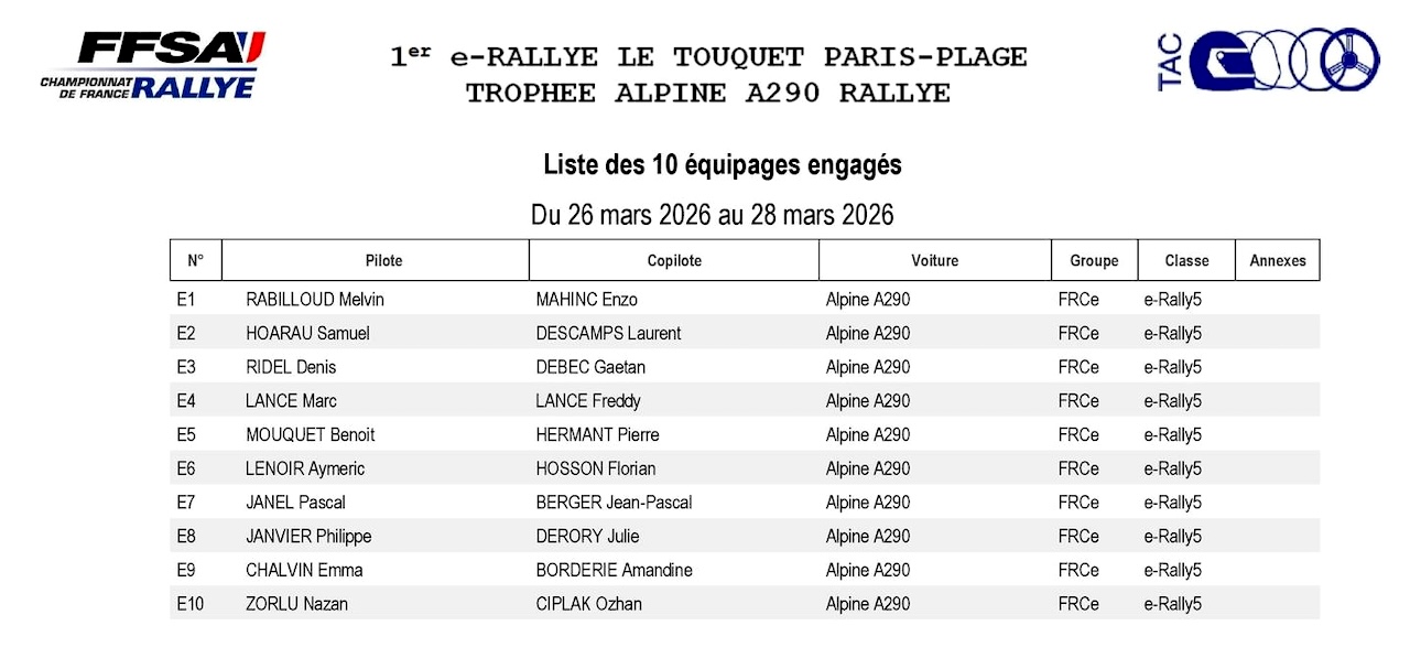 Rallye du Touquet 2026 : La liste des engagés Moderne, e-rallye Alpine, VHC et VHRS