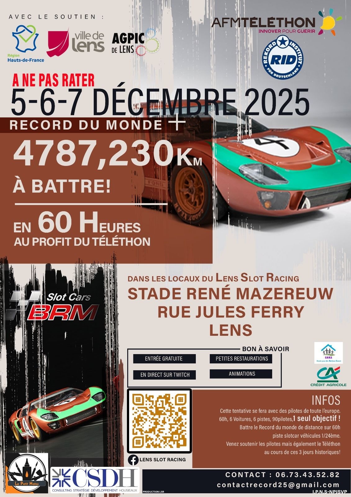 Les 5, 6 et 7 décembre, le club Lens Slot Racing réunira pilotes, bénévoles et passionnés pour une nouvelle tentative de record du monde de distance parcourue en 60 heures. Une aventure sportive autant qu’humaine, organisée au profit du Téléthon.